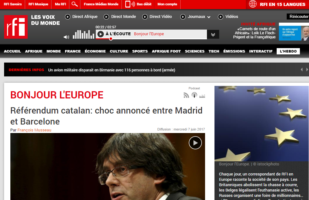 En aquest sentit, també ha explicat que “el president de Catalunya vol organitzar un referèndum d’autodeterminació, costi el que costi, i si Madrid s’hi oposa, declararà la independència unilateral”. D’altra banda, també ha explicat la posició de Rajoy: “El govern central titlla la iniciativa d’il·legal i afirma que s’hi oposarà per tots els mitjans legals”. El corresponsal a la capital espanyola ha ampliat i contextualitzat la informació, apuntant que Rajoy ha precisat que la policia judicial s’oposarà que les urnes siguin instal·lades a Barcelona i a la resta de Catalunya”.