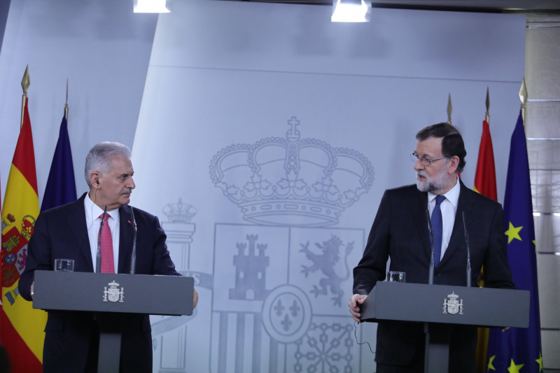 “VI Reunió d'alt nivell Hispano-Turca. Lluita contra el terrorisme, les relacions comercials i assumptes de Defensa, entre altres assumptes a tractar”, ha escrit Mariano Rajoy al seu compte de Twitter. S'ha reunit al Palau de la Moncloa amb Binali Yildirim, per presidir la VI cimera bilateral entre els dos països. L'escena ha estat, si més no, trista: el president espanyol escoltant l'himne d'una dictadura. Quatre ministres espanyols es reuniran també amb els seus respectius homòlegs turcs: el d'Interior, Juan Ignacio Zoido; Economia, Román Escolano; Foment, Íñigo de la Serna, i Agricultura, Isabel García Tejerina.