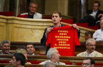 En aquest punt, el líder de C’s ha mostrat a l’hemicicle una samarreta de la selecció espanyola amb els noms dels jugadors catalans gravats: Puyol, Xavi, Navarro, Iniesta, Cesc, Garcia i Capdevila. En aquests moments s’ha sentit algun xiulet a la sala. ‘Això representa el que volem molts ciutadans de Catalunya’, ha dit Rivera, ‘els catalans participant a la selecció espanyola i liderant l’esport català i espanyol’. Rivera creu que això és ‘l’esperit contrari al pacte de govern que defensa segregar aquesta selecció’.