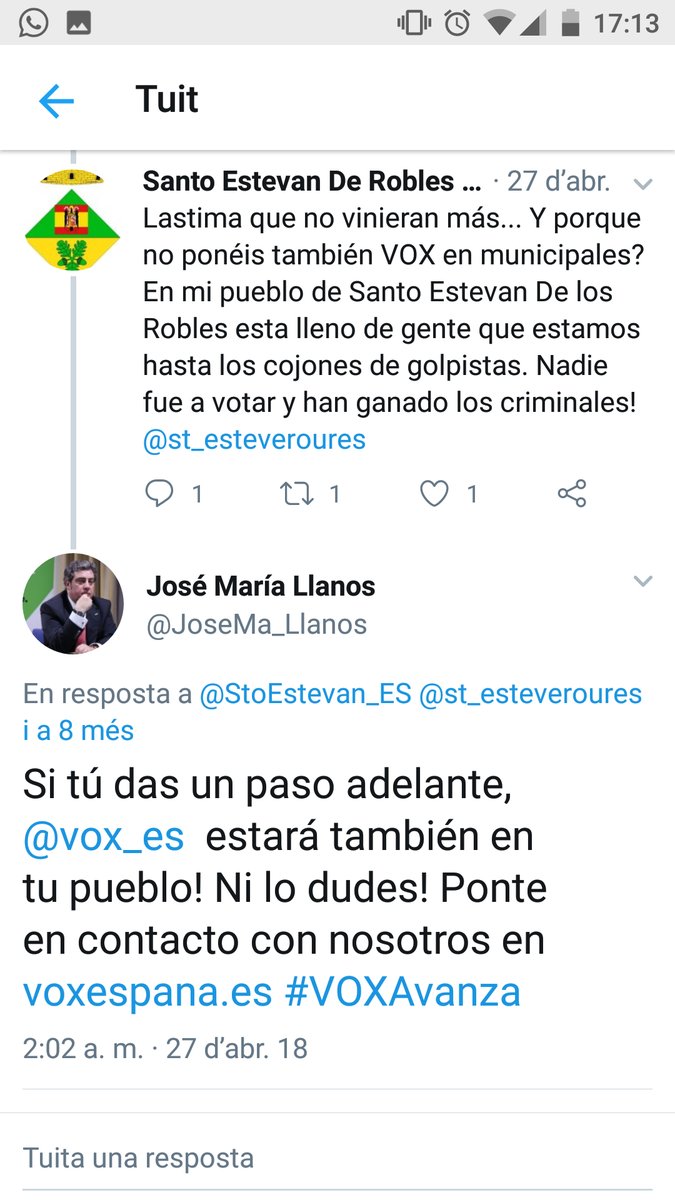 El president de Vox a València va empassar-se el tuit i el va emplaçar a contactar amb el partit per a les municipals del 2019. “Si tu fas un pas endavant, Vox estarà també al teu poble. Posa't en contacte amb nosaltres”, va respondre Llanos.