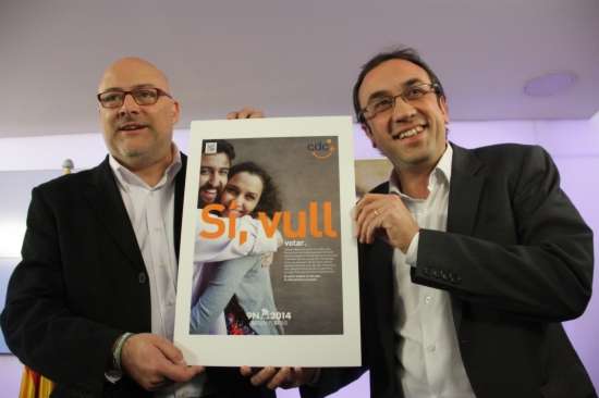 El vicesecretari de Coordinació Institucional, Lluís Corominas, i el secretari d'Organització de CDC, Josep Rull, han presentat aquest divendres la campanya de la consulta, amb el lema 'Sí, vull votar', i quatre imatges gràfiques. En la primera, que és el cartell principal, apareix una parella abraçant-se amb el lema 'Sí, vull votar', a més d'un text que explica els motius per reivindicar la consulta; en la segona imatge, un avi i el seu net bebè apareixen en primer pla amb la frase 'Sí, vull decidir el nostre futur', afegint així l'element generacional; el tercer cartell el protagonitza una noia jove amb el lema 'Sí, vull ser optimista', i l'últim és un home jove vestit amb corbata que diu 'Sí, vull construir un nou país'.