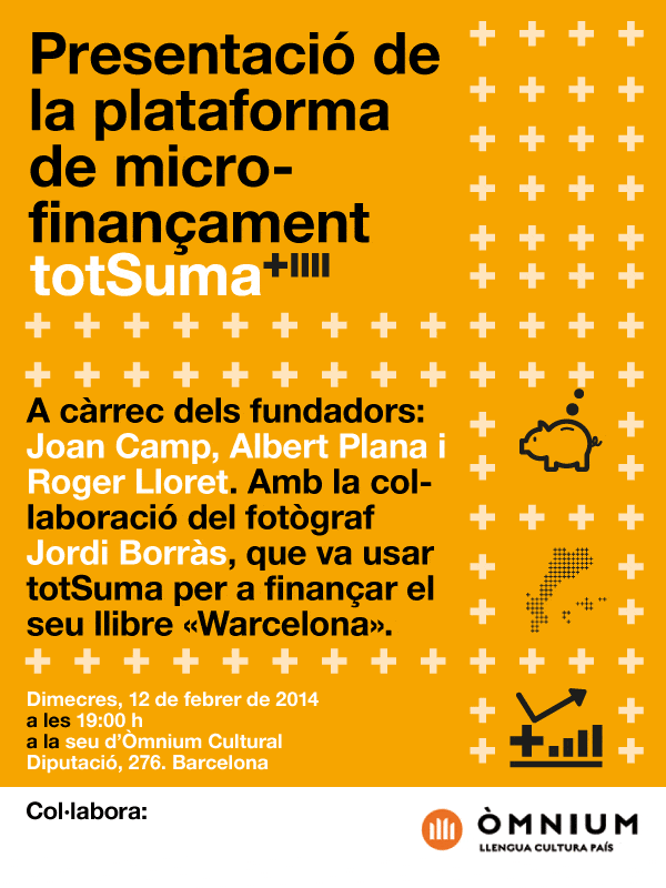 TotSuma és una plataforma de finançament col·lectiu que té com a fet diferencial la seva vocació social i compromís amb la construcció nacional catalana. TotSuma vol ser l’eina que faci possible finançar tota mena de projectes que comparteixin un mínim comú denominador de voluntat de progrés i sobirania pel país. Enllaç de l'esdeveniment a Facebook.