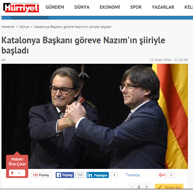 Avui, el rotatiu Hürriyet (en turc, llibertat) que és un dels diaris més llegits de Turquia (juntament amb Zaman i Sabah), ha dedicat tota una notícia a Carles Puigdemont i al procés català gràcies a la cita del president a una de les grans figures del país otomà, Nâzım Hikmet.
