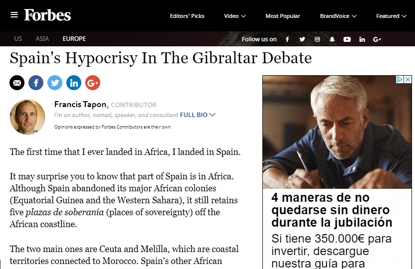 És llavors quan defineix la política territorial d'Espanya com “hipòcrita” quan posa el cas de Gibraltar. L'articulista posa de manifest les contradiccions que afloren quan es comparen els dos casos: per una banda reclama Gibraltar al Regne Unit i per l'altra nega cedir els territoris africans al Marroc.