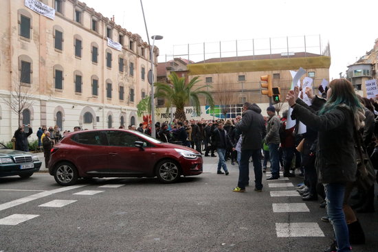 Els manifestants s'han concentrat a la petita plaça que està a la part posterior de la Model, a la cruïlla dels carrers Rosselló amb Entença, on estava previst fer-se l'acte. Quan Bosch ha anunciat que se suspenia, ha rebut una forta xiulada i els concentrats han començat a mostrar cartells i ha cridar consignes com 'Mundó dimissió' o 'La Model no es tanca sense la Zona Franca'. Tot seguit, han tallat el carrer Entença i han fet una marxa de protesta improvisada que ha arribat fins a la Gran Via. També des del pis superior de l'edifici penitenciaria s'han despenjat dues pancartes on es podia llegir 'Colau i Junqueras ens desnonen, Mundó menteix' i 'Ja n'hi ha prou de menysprear els treballadors'.