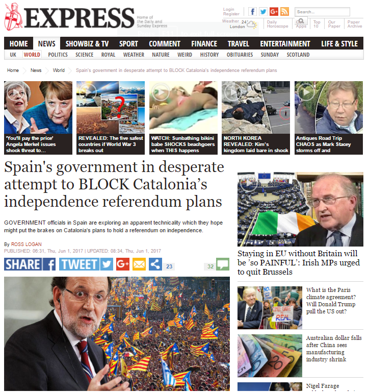 El rotatiu Express explica la voluntat del govern català de fer un referèndum d’autodeterminació i fa evident la negativa reiterada de Rajoy. En aquest context, entra en detalls sobre fins on està disposat a arribar la Moncloa: “Amb aquesta data límit apropant-se [la de setembre], les autoritats a Madrid estan estudiant si el referèndum pot o no ser bloquejat evitant que la gent s’apropi a les urnes, literalment”. Així, menciona la querella de la fiscalia a la consellera Meritxell Borràs per licitar urnes.