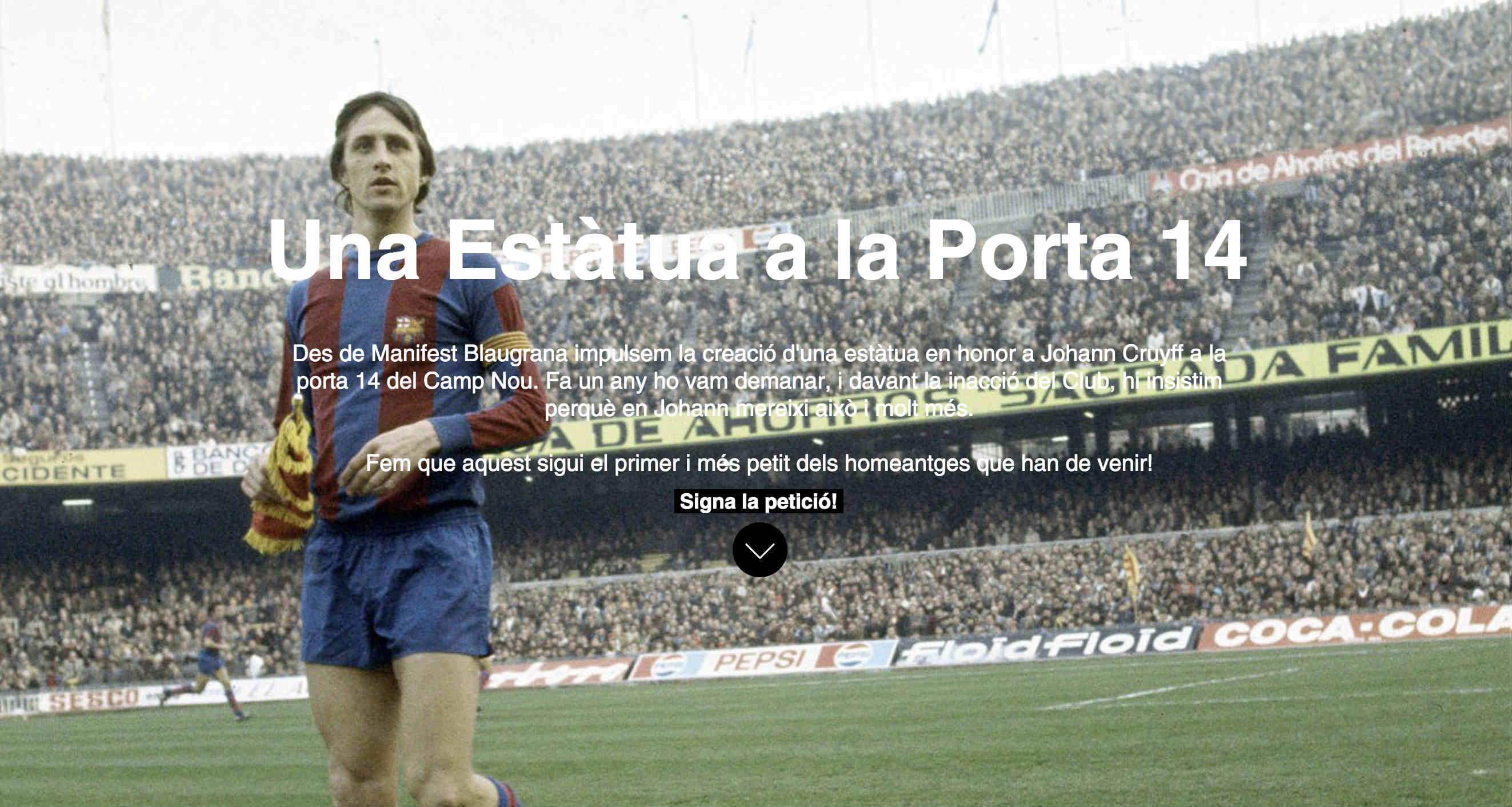 Segons declara manifest, quasi un any després de la pèrdua de Johan Cruyff el FC Barcelona no ha realitzat cap acte d'homenatge “digne” a l'holandès, “pare del Barcelona modern”. Manifest Blaugrana considera que “després d'un any de silenci per part del Club” és moment que l'associació reprengui la campanya #EstatuaPorta14 per aconseguir que s'aixequi una estàtua al davant de la porta 14 del Camp Nou en honor a Cruyff. Per això, l'entitat va emetre un burofax al Barça perquè atengués a la petició qualsevol soci i aficionat del club s'hi sumés a través del portal memorial14.cat, que ja compte amb més de mil adhesions.