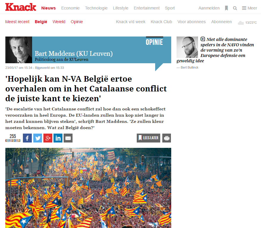 Maddens fa un repàs del procés d’ençà les eleccions al Parlament de 2015 i constata que “el drôle de guerre [guerra de broma] entre Catalunya i Madrid sembla que s’acaba, les hostilitats reals estan venint”. Així, explica el contingut de la filtració d’El País de dilluns, menciona la conferència de Puigdemont a Madrid també dilluns –i cita el digital Doorbraak per assegurar que hi va assistir l’ambaixador de Bèlgica–, diu que el president català té encara la “porta oberta” per un referèndum pactat, tot i que prepara un d’unilateral per si Madrid no s’assegués.