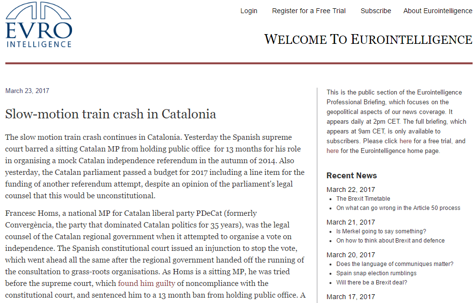 L’article també explica la sentència del Tribunal Suprem contra Francesc Homs, que haurà de deixar de ser diputat un any i un mes. Tot plegat, amb un titular entenedor: “Xoc de trens a càmera lenta a Catalunya”. Eurointelligence està dirigida per l’analista Wolfgang Münchau, un dels fundadors de l’edició alemanya de Financial Times el 1999 que encara ara escriu columnes al prestigiós diari econòmic britànica i a altres mitjans, com Corriere della Sera.