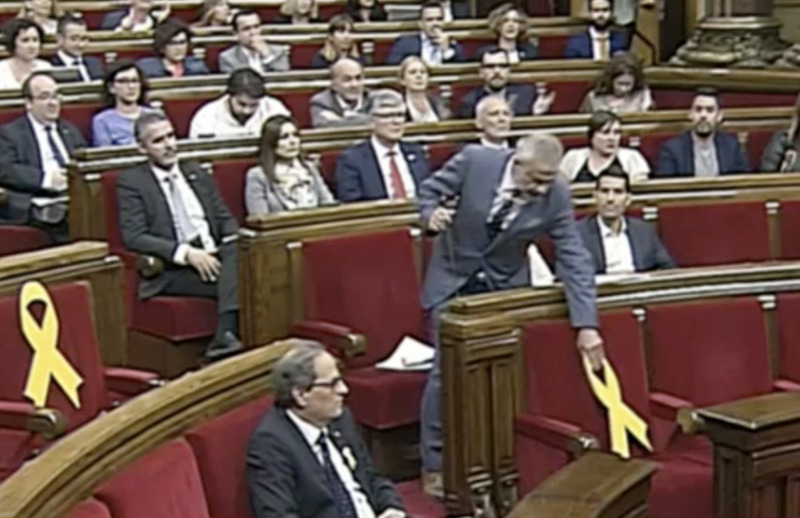 .@rogertorrent suspèn el ple @parlamentcat, per un incident amb el diputat de @C's Carles Carrizosa, que ha retirat un llaç groc d'un escó. #ElsMatinsTV3