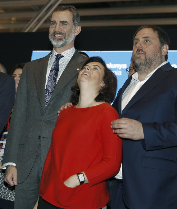 Les portades d’avui d’El Mundo i La Vanguardia (i no són els únics tant en paper com digitals) recullen una instantània dels vicepresidents dels dos territoris amb Oriol Junqueras agafant per les espatlles Soraya, com si del seu pare es tractés. Mentrestant, ella somriu i fa la sensació que està passant una molt bona estona. Al costat, el Rei, per sobre del bé i el mal –literalment en aquest cas, donada l’alçada–, també somriu. La interpretació del diari madrileny mitjançant un peu de foto en majúscules i en un lloc destacat és clara: “La complicitat dels vicepresidents”. El rotatiu del Grupo Godó segueix la mateixa línia, subratllant les “escenes de distensió” entre tots dos.