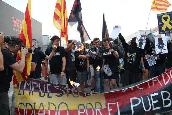 A la concentració convocada pels CDRs diferents persones amb màscares d'elefants (recordant el passat caçador de Juan Carlos I) han cremat fotos del rei.