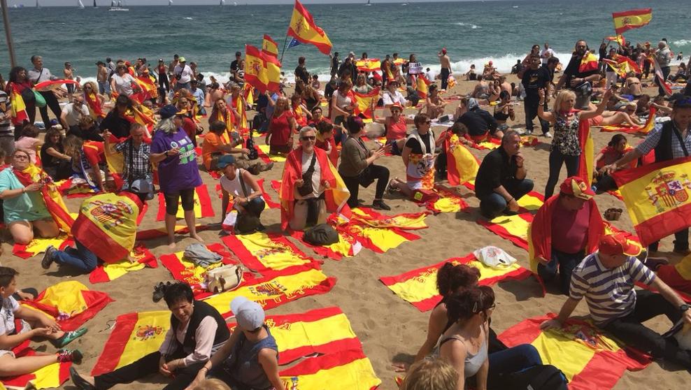 Un centenar de banderes espanyoles assentades ara a la platja de la Barceloneta com si fossin tovalloles