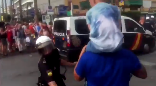 BOOM| Un membre de la Policia Nacional espanyola agredeix a un afeccionat anglès que carregava al seu fill menor d’edat a les espatlles.