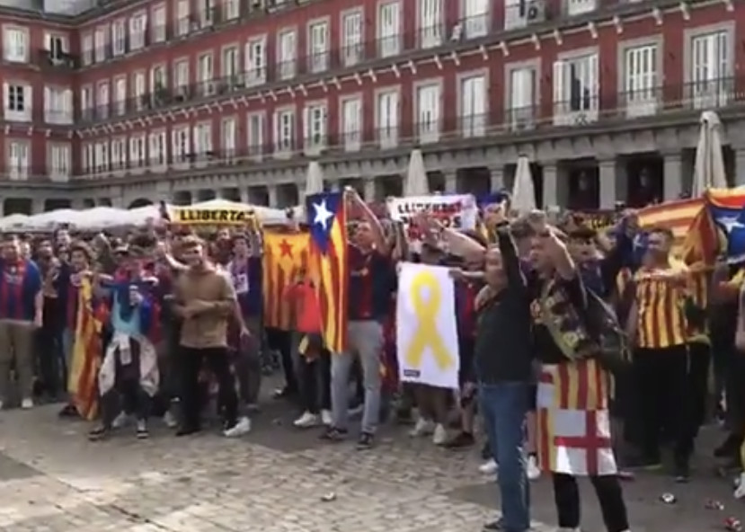 En el vídeo, registrat a la Plaza Mayor, es pot veure com un grup de seguidors blaugranes van cantar, estelades amunt i puny alçat, el cant dels Segadors davant un dispositiu policial que semblava preparat per controlar un grup de hooligans.