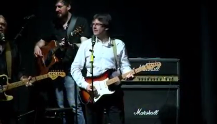 Toni Clapés li ha demanat que toqués la guitarra i després de preguntar al públic “l'atraquem?” i que el públic, unànime, digués que sí, Puigdemont ha acceptat. S'ha penjat una guitarra al coll i ha tocat la cançó 'Camins' que comença amb un riff de guitarra que ell mateix ha interpretat. Ha tocat la cançó sencera i ho ha fet bé, demostrant els seus dots de músic fins ara desconeguts. Puigdemont ha interpretat el tema serè i amb èxit malgrat les constants desafinades (a les que malauradament ja ens té acostumats) de Gerard Quintana. De fet, només amb l'entrada, totalment fora de to, Puigdemont ha fet una mirada assassina i de sorpresa a Quintana.