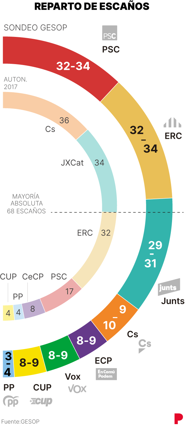 APSC i ERC empatarien en primera posició, seguits de prop per JxCat que se situaria en tercer lloc a les eleccions del 14-F. Segons una enquesta publicada aquest diumenge a ‘El Periódico’, tant els republicans com els socialistes podrien obtenir entre 32 i 34 diputats, seguits del partit encapçalat per Laura Borràs, que esdevindria tercera força amb 29-31 escons. Ciutadans baixaria fins als 9-10 escons, així com el PPC, que podria passar de tenir-ne 4 a 3. Pel que fa als comuns i la CUP, el sondeig preveu que pugin fins a un màxim de 9 diputats. El PDeCat quedaria fora del Parlament, mentre que Vox entraria amb 8-9 escons. L’enquesta preveu una participació del 60%.