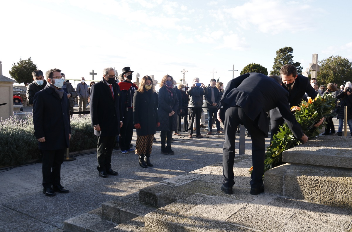 El vicepresident també ha lloat la figura de Macià, “referent dels valors republicans” i defensor dels drets dels treballadors i de la independència de Catalunya. “A Catalunya no ens venceran perquè no aconseguiran derrotar la nostra voluntat”, ha afegit, emulant unes paraules de l’expresident de la Generalitat. Aragonès ha fet l’ofrena en nom del Govern al costat de la consellera de Presidència, Meritxell Budó, i de l’expresident Quim Torra, que va ser inhabilitat.