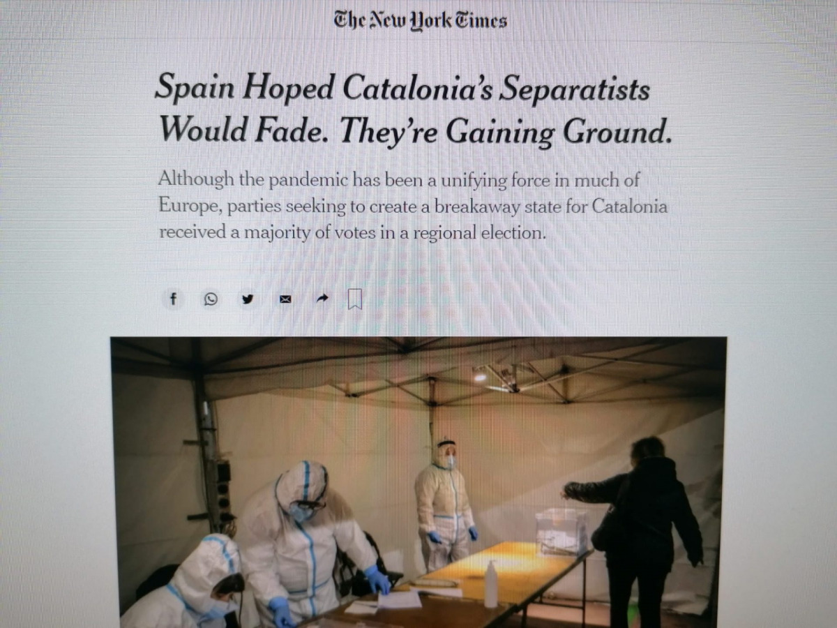 El The New York Times fa una lectura dels resultats del 14-F molt favorable a l’independentisme davant les falses expectatives del govern espanyol que creu que “esperava que es desinflés”. El prestigiós rotatiu nord-americà destaca que el moviment independentista “no mostra signes d’implosió”, al contrari, “els partits que pretenen la ruptura amb Espanya van augmentar la seva majoria al Parlament regional”. Afegeix que el coronavirus va reduir dràsticament la participació electoral, però que en el recompte final van superar el 50% dels vots, “un premi que se’ls havia resistit durant molt de temps”. Recullen valoracions del membre de l’ANC, Adrià Alsina: “és un argument menys per a aquells que estan en contra de la independència i diuen que mai no vam aconseguir la majoria”.