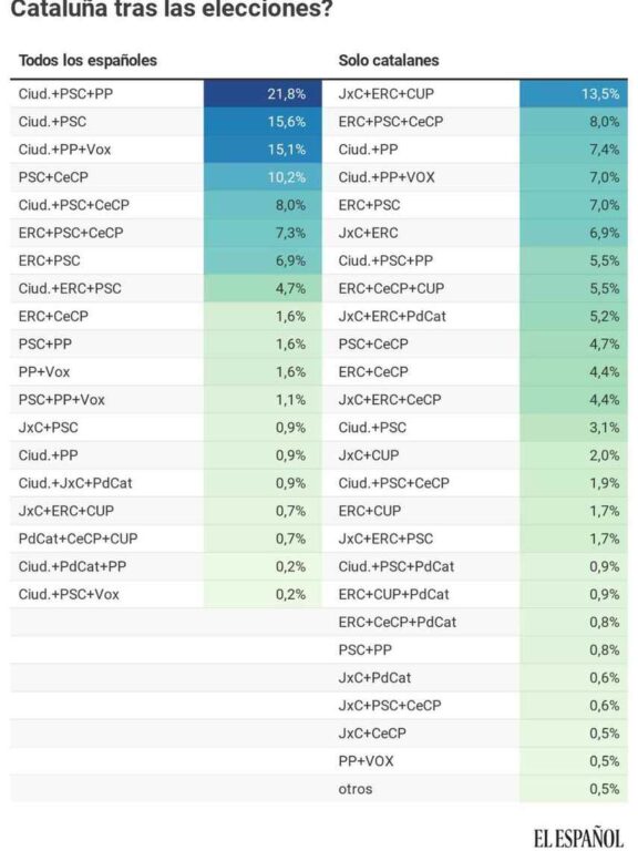 A Catalunya l’opció d’un govern de Cs, PP i VOX recull un 7% de preferències, el mateix percentatge que un executiu format per ERC i el PSC. El de Junts+ERC és el preferit d’un 6,9% dels enquestats mentre que el d’ERC+comuns+CUP ho és per un 5,5%, igual percentatge que els que voldrien la fórmula Cs+PSC+PP. Un 5,2% voldria un acord entre Junts, ERC i PDeCAT, tot i que a aquest últim patit l’enquesta no li dona representació. La fórmula de Junts+ERC+comuns té un 4,4% de suports. La de Junts+CUP un 2% i la d’ERC+CUP, un 1,7% .