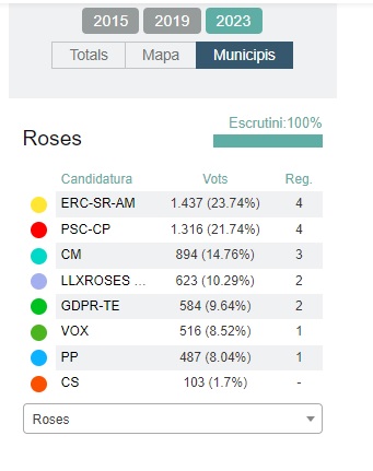En les eleccions del 28 de maig, ERC i PSC van aconseguir quatre regidors cadascun. Junts es va quedar amb tres (un menys que al 2019); Lliures x Roses, amb dos, Gent del Poble, dos més i el PP i Vox en van aconseguir un cadascun. La majoria absoluta a la localitat se situa en els nous regidors (el consistori en té disset en total), que són els que aconsegueixen amb aquest pacte les tres formacions que governaran Roses en tripartit els pròxims quatre anys.