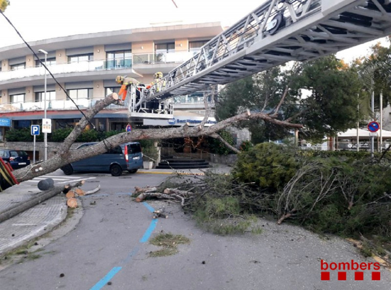Els Bombers de la Generalitat encara estan treballant aquest dissabte al matí en diverses incidències relacionades amb l’episodi de vent. Un pi de grans dimensions ha caigut aquesta matinada a tocar del passeig Marítim de Castelldefels (Baix Llobregat) i, de retruc, ha tombat part del cablejat elèctric a la zona. L’avís del succés s’ha rebut a les 05.58 hores al carrer del Dofí, molt a prop de l’entrada de l’hotel Best Western. El pi, de més de 8 metres d’alçada, ha caigut per la força del vendaval i ha arrossegat un parell de pals de la llum. No hi ha hagut danys personals, però sí afectacions en alguns dels cotxes aparcats. Quatre dotacions dels Bombers amb l’ajuda de l’autoescala han retirat l’arbre. En paral·lel, els Bombers també enretiren aquest matí un altre arbre que ha caigut dins del recinte d’un institut de Vilafranca del Penedès.