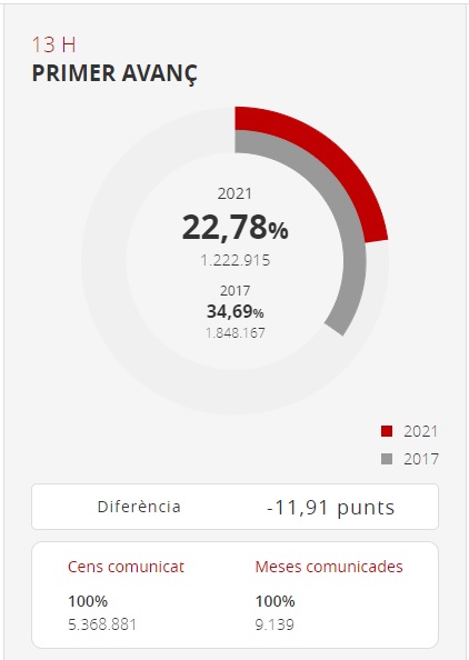 El 22,78% dels catalans cridats a les urnes havia votat fins a les 13.00 hores. Són 11,91 punts menys que en les eleccions del 21-D del 2017, quan es registrava una participació del 34,69% a la mateixa hora. En els comicis del 27 de desembre del 2015 la participació a les 13.00 hores era del 35,10%. Per demarcacions, a Barcelona ha votat un 22,49% amb més del 90% de les meses comunicades (a les anteriors ho va fer el 34,58%), a Girona ha exercit el seu dret a vot el 24,29% (fa quatre anys ho va fer el 35,20%), a Lleida ha participat un 24,18% que contrasta amb el 34,41% del 2017 i a Tarragona i Terres de l’Ebre ho ha fet el 22,70% (la xifra del 2017 era del 35,11%).