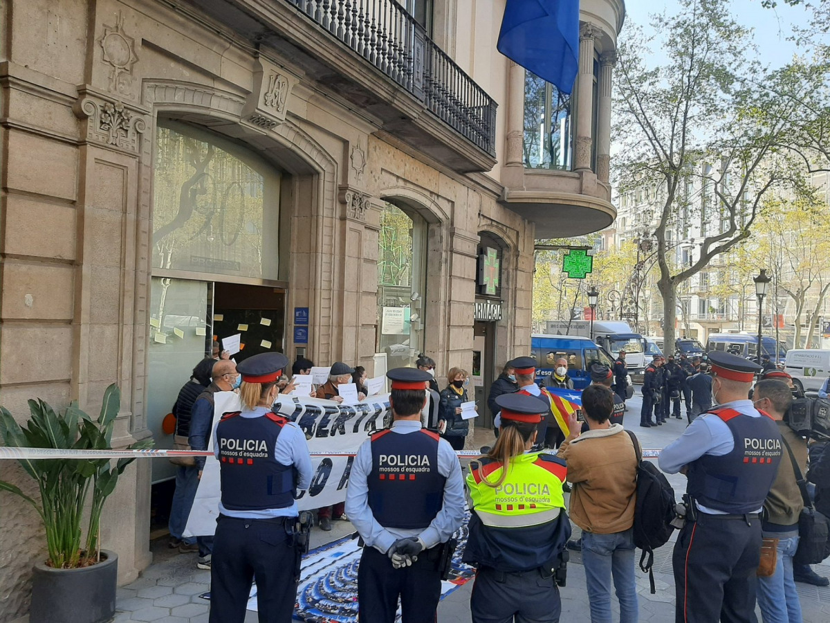 Un grup d’activistes ha fet una acció sorpresa de protesta aquest matí a les portes de la seu a Barcelona que comparteixen la Comissió Europea i el Parlament europeu per denunciar la passivitat de les institucions europees davant de l’acció repressiva de l’Estat espanyol. Els activistes de la plataforma Desobediència Civil han ocupat el replà de l’edifici i han exhibit una pancarta que reclamava la llibertat del raper Pablo Hasel. També han exhibit una gran fotografia de l’hemicicle del Parlament Europeu durant la votació sobre el suplicatori dels eurodiputats independentistes i han mostrat papers on es podia llegir “la Unió Europea no defensa els nostres drets”. La protesta ha començat a les nou del matí i s’ha allargat vint minuts, fins que agents dels Mossos d’Esquadra han desallotjat els manifestants i els han portat a les furgonetes per identificar-los.