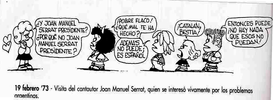 El 1954 va publicar la seva primera pàgina i, des de llavors, ha publicat vinyetes, dibuixos i historietes en diaris i revistes d’Amèrica i Europa. Amb el cop d’estat a l’Argentina del 1976, es va exiliar a Milà. El 1990 va adoptar la nacionalitat espanyola i des de llavors va alternar residència entre Madrid i Buenos Aires. Com es veu en la següent vinyeta, Quino tenia clara la diferència entre catalans i espanyols: