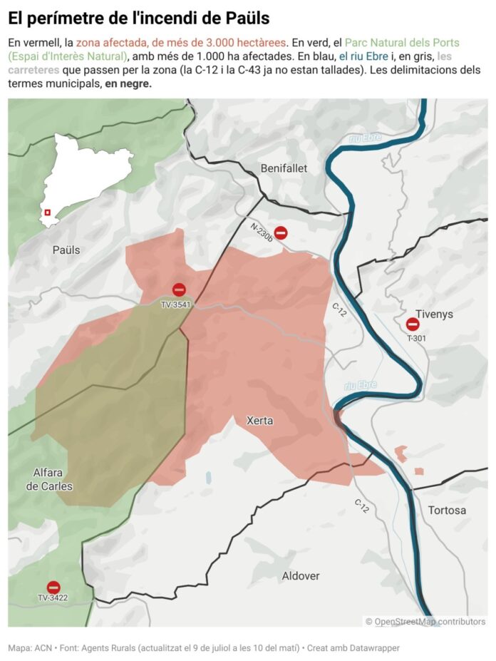 Les carreteres C-12 i C-43 han quedat reobertes aquest matí, després d’haver estat tallades entre Tortosa i Rasquera i de Benifallet a Pinell de Brai, respectivament, per l’incendi de Paüls. Aquestes han estat les primeres carreteres a obrir-se, i poc després s’ha obert també la TV-3422 d’Alfara de Carles a Aldover i la T-301 entre Benifallet i Tivenys. Ara per ara, les úniques carreteres que es mantenen tallades són la TV-3541 de Paüls a Xerta, i l’N230b a Xerta.