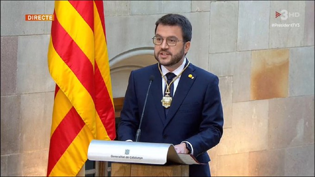 El president de la Generalitat, Pere Aragonès, ha pres possessió del seu càrrec aquest dilluns a la tarda en un acte sobri al Pati dels Tarongers del Palau de la Generalitat. El seu antecessor, Quim Torra, li ha imposat la medalla del president davant d’una quarantena d’assistents a l’acte, entre les quals hi havia la presidenta del Parlament, Laura Borràs; el president d’ERC, Oriol Junqueras; el secretari general de JxCat, Jordi Sànchez; el president d’Òmnium, Jordi Cuixart; l’alcaldessa de Barcelona, Ada Colau; el ministre de Política Territorial i Funció Pública, Miquel Iceta, i la delegada del govern espanyol a Catalunya, Teresa Cunillera. També s’ha pogut seguir la cerimònia des del Saló Sant Jordi a través d’una gran pantalla.