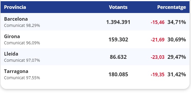 La participació a les eleccions europees d’aquest diumenge és del 33,69% a Catalunya a les 18.00 hores, 16,88 punts menys que el 2019 (50,57%). Fa quatre anys, però, els comicis van coincidir amb les eleccions municipals. En les europees del 2014 la participació a les 18.00 hores a Catalunya va ser lleugerament superior, amb un 35,4%. Per demarcacions, Lleida és on ha caigut més el nombre de votants: 29,47% de participació (uns 23 punts menys), seguida de Girona, amb el 30,69% (21,7 punts menys). A Tarragona és del 31,42% (19,4 punts menys) i a Barcelona és del 34,71% (15,5 punts menys). La participació a les eleccions europees al conjunt de l’Estat a les 18.00 hores és del 38,33%, 11,11 punts menys que el 2019.