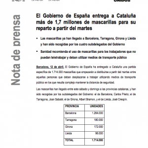 La partida destinada a Catalunya forma part dels 10 milions de mascaretes específicament adquirides i gestionades pel Govern central que van arribar a Espanya per via aèria divendres a la nit. Aquesta mesura s’emmarca en l’estricta limitació de moviments vigent des de l’inici de l’estat d’alarma i està d’acord amb les recomanacions del Ministeri de Sanitat, entre les quals hi ha l’ús de mascareta per als treballadors presencials.
