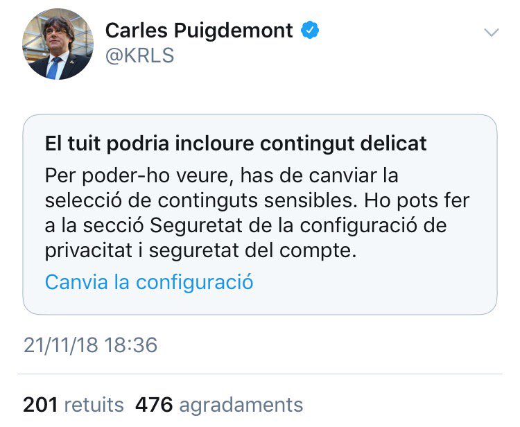 Hola @TwitterEspana @NathaliePicquot: Varios usuarios nos hacen saber que ven los tuits del #president @KRLS como “material sensible”. Hoy mismo con @aiww. Desde cuando los derechos humanos son material sensible? O es por orden del Rey? 👇