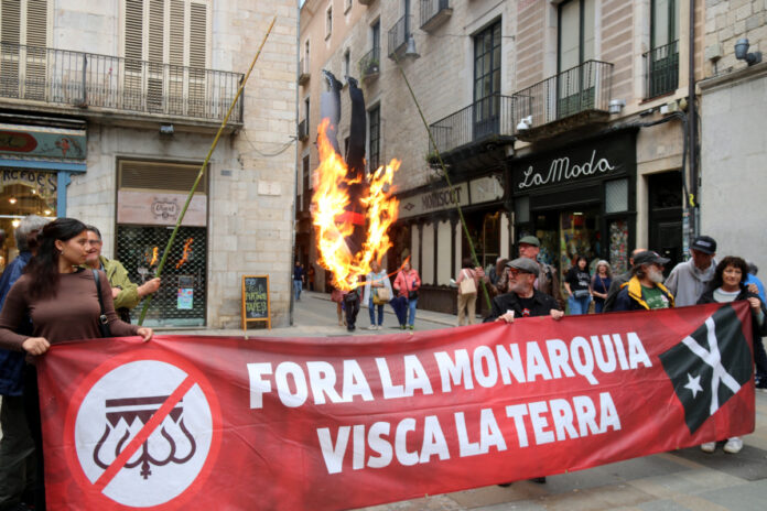 Membres de la Taula per la Independència i la Plataforma Antimonàrquica de Girona han cremat un ninot de cartró de Felip VI cap per avall per reclamar a l’Ajuntament que no pengi la foto del monarca a la sala de plens. Ho fan en resposta a la sentència que es va conèixer fa pocs dies, després que Vox portés l’afer als tribunals i el jutjat contenciós donés la raó al partit d’ultradreta. La sentència també obliga a penjar la bandera espanyola en un lloc destacat a l’interior del consistori. El portaveu dels manifestants, Quim Tell, ha llegit un manifest que subratlla que Girona “no té ni rei ni princesa” i que demana a Guanyem, JxCat i ERC “deixar les parets netes de qualsevol imatge vinculada amb les institucions repressores espanyoles”.