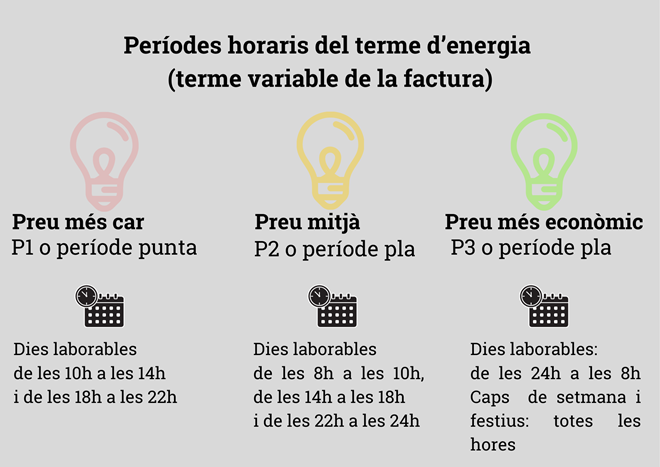 Per treure profit econòmic a aquest canvi, és recomanable, en la mesura del possible, que en períodes més cars es redueixi l’ús dels aparells que més energia consumeixen, com la calefacció, la vitroceràmica, el rentaplats o l’assecadora. Aquests aparells es poden programar per al període pla que potser té horaris més compatibles amb les nostres rutines diàries. Però l’estalvi a la factura serà més gran si els aparells que més consumeixen s’utilitzen en les hores vall o bé els caps de setmana, sempre que les necessitats i condicions comunitàries ho permetin.