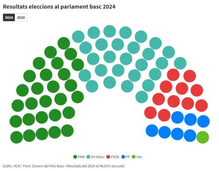 El PNB i EH Bildu empaten a 27 escons com a primera força al parlament basc, amb l’escrutini de les eleccions d’aquest diumenge superior al 98%. El recompte situa el PSE-EE com a tercera força amb 12 diputats, seguit del PP amb 7 i de Vox i Sumar amb 1 cadascun. Amb aquests resultats provisionals el PNB es podria garantir la majoria absoluta a la cambra si obté el suport dels socialistes, ja que se situa en 38 escons. També podrien reeditar el govern de coalició de la passada legislatura, ja que en cas que cap candidat a lehendakari no aconsegueixi majoria absoluta és investit l’aspirant amb més suports.