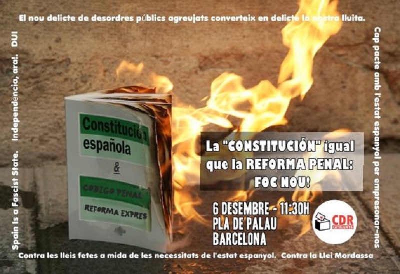 Convocatòria dels Comitès de Defensa de la República (CDR) a cremar la Constitució Espanyola el proper dia 6D, mitja hora abans que comenci la manifestació de l’AANC al Pla de Palau. Amb el lema, “la Constitución igual que la reforma penal: foc nou”.