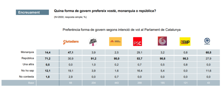 D’altra banda, segons la intenció de vot dels partits del Parlament que presenta el CEO, els partits independentistes presenten nombres extremadament baixos de preferència per una monarquia, mentre que el PP guanya per golejada en el desig de seguir tenint un cap d’estat, amb un 60,5% de la seva intenció.
