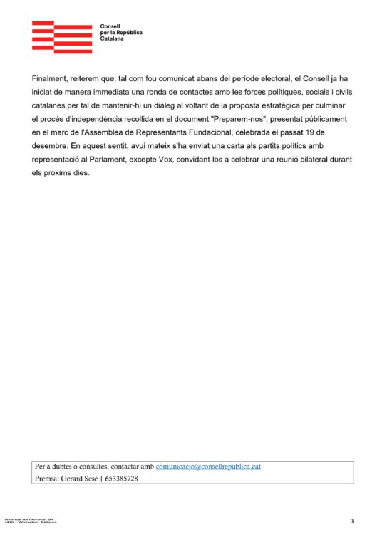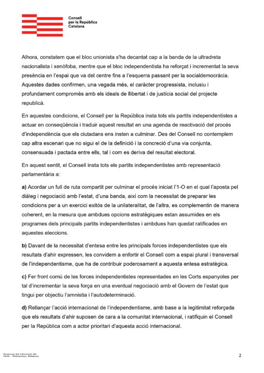 A partir d’aquí, el consell insta els partits independentistes a reactivar el procés d’independència, matisant que no contemplen “cap escenari que no sigui el de la definició d’una via conjunta, consensuada i pactada entre ells, tal com es deriva del resultat electoral”, i demanant un full de ruta per tal de “culminar el procés iniciat l’1-O”. A més, constaten que l’entesa entre els partits també s’ha de notar de cara al Consell, que demana enfortir-se com a espai plural i transversal de l’independentisme, i ratificar-se com a actor prioritari en l’acció internacional.