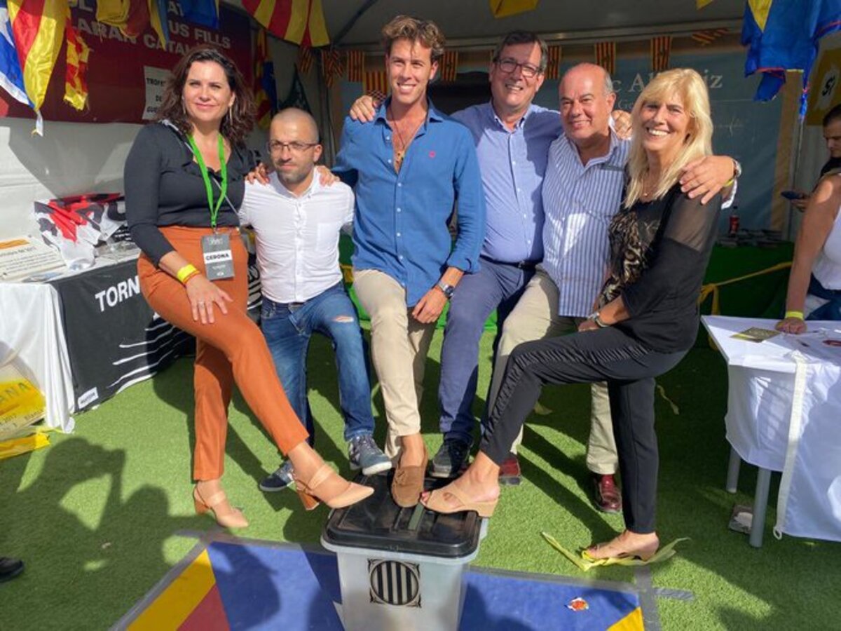 Nazis de Vox de la carpa de Girona del aquelarre Viva 22 acompañados del excremento Javier Negre exponiendo patéticamente con orgullo las esteladas, la cartelería… que han arrancado en Catalunya, un lazo amarillo colocado del revés…
