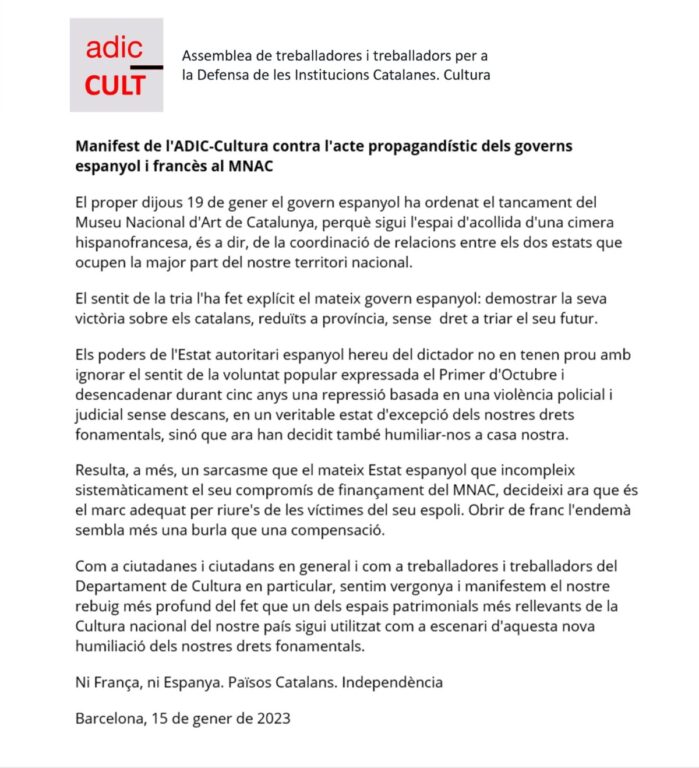 L’Assemblea de treballadores i treballadors per a la Defensa de les Institucions Catalana (ADIC) és l’última a sumar-se contra la cimera francoespanyola que el pròxim 19 de gener reunirà al MNAC als presidents Pedro Sánchez i Emmanuel Macron per a, entre altres coses, demostrar que el procés independentista ha acabat, segons va declarar el president Sánchez. En un manifest publicat el matí d’aquest dilluns 16 de gener, l’ADIC carrega contra “l’acte propagandístic dels governs espanyol i francès al MNAC”. “Sentim vergonya i rebuig del fet que un dels espais patrimonials més rellevants de la Cultura nacional del nostre país sigui utilitzat com a escenari d’aquesta nova humiliació dels nostres drets fonamentals”, exposen al manifest.