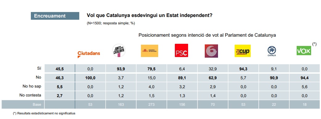 Més dades d’aquesta enquesta: Un 4% dels votants d’ERC no saben si volen la independència, en contrast amb el 0% dels votants de la CUP i un 1,2% dels votants de Junts.