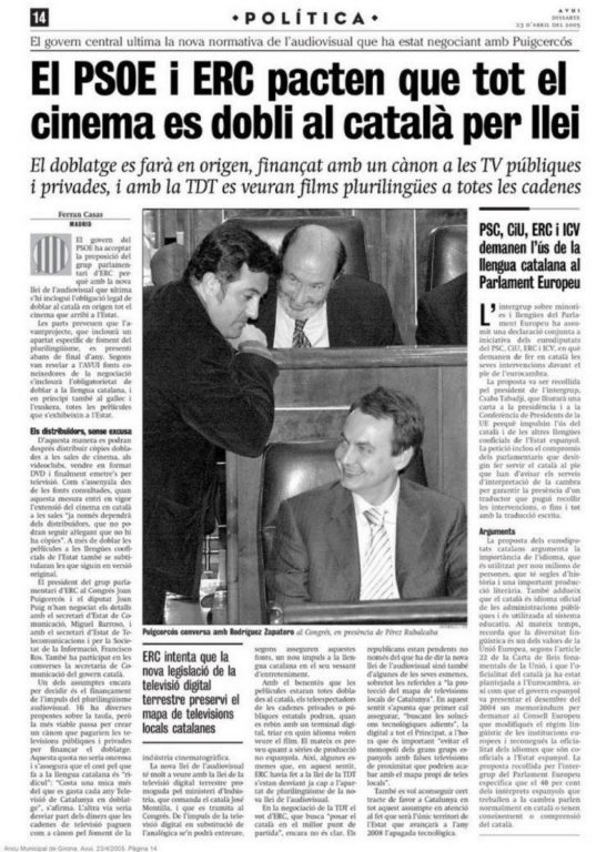 L’hemeroteca, però, ha jugat una mala passada al Gobierno “més progressista de la història”. En detall, l’executiu de Zapatero va prometre que, per llei, faria que tota l’oferta audiovisual s’hagués de doblar al català.