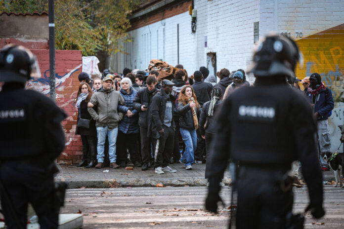 Un ampli dispositiu policial acordona la zona i apropar-se a l’edifici és del tot impossible per a tota persona que no tingui el vistiplau dels Mossos. El Sindicat de l’Habitatge, Badalona Acull i diverses entitats socials s’havien citat a les portes del B9 quan hi hagués el desallotjament.