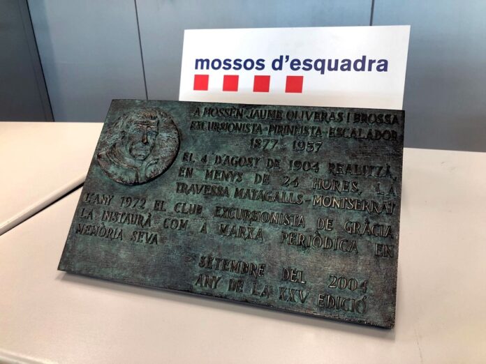 Els Mossos d’Esquadra han recuperat la placa de bronze commemorativa robada al cim del Matagalls (1.697 metres). La placa, de 40×25 centímetres, estava instal·lada a la Creu de Matagalls en honor del mossèn Jaume Oliveras i estava catalogada com a patrimoni cultural al Parc Natural del Montseny. Va desaparèixer en un moment indeterminat entre els anys 2020 i 2021, i els fets es van denunciar aquest 2023 pel Club Excursionista de Gràcia. Els investigadors van veure la placa a la venda en un portal d’internet dedicat al col·leccionisme i van iniciar les comprovacions per veure si era la placa original. Hi ha dos investigats: el venedor situat en una botiga d’antiguitats a la Comunitat de Madrid i el comprador ubicat a Catalunya.