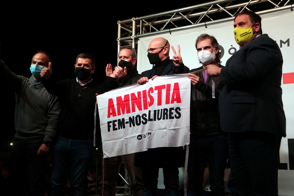 Més d’un centenar de persones s’han reunit a les portes de la presó per mostrar el seu escalf i suport. Resignats, però ferms amb la defensa de les seves idees. Així han arribat els polítics independentistes a Lledoners abans del seu reingrés a la presó. Tots a excepció de Rull, que és l’únic que no ha tornat perquè aquest dimarts ha estat operat quirúrgicament. En la seva intervenció, des de les portes de Lledoners i només uns minuts abans d’entrar, Junqueras, Romeva, Turull, Forn, Sànchez i Cuixart han fet una crida a la persistència i a la unitat, i han assegurat que no renunciaran ni es mouran “un mil•límetre” dels seus ideals. Més d’un centenar de persones han mostrat el seu escalf als líders empresonats. També els principals dirigents polítics des partits independentistes.