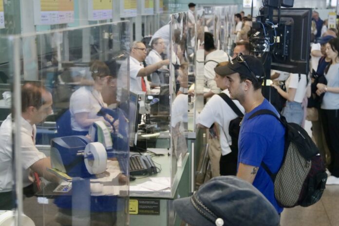 Les cues de cada estiu davant els taulells de facturació i el personal de les aerolinies facturant l’equipatge i traient targetes d’embarcament des dels ordinadors, ja aple rendiment. És la imatge d’aquest divendres al migdia a la zona de sortides de la terminal principal del Prat.