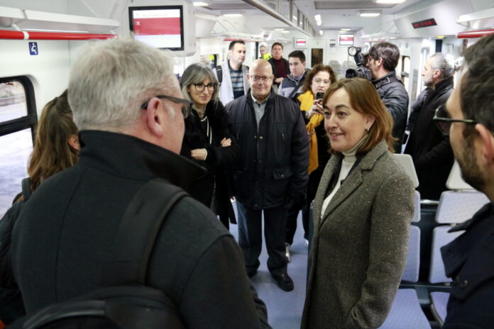 La consellera Paneque ha encapçalat el viatge inaugural de la nova línia de tren RL4. Ho ha fet acompanyada de la directora de Transports i Mobilitat, Susi López; el director de Rodalies, Antonio Carmona; el gerent de FGC Rail, Ramon Vall, i l’alcalde de Lleida, Fèlix Larrosa, a més d’altres autoritats i alcaldes de municipis per on circula la nova línia.