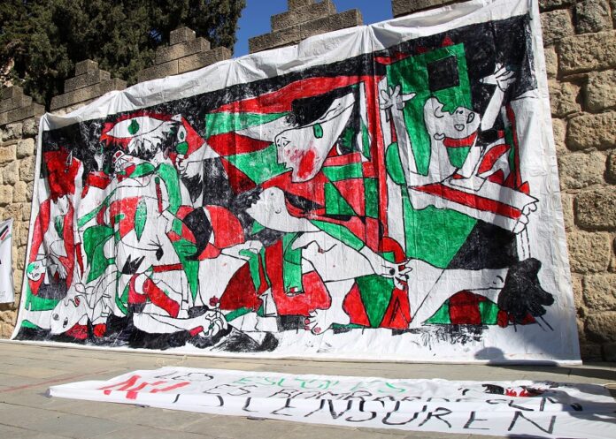 Famílies de diferents col·legis de Sant Cugat del Vallès han repintat a mida real el ‘Guernica’ de Picasso que diuen l’Ajuntament va “censurar” al novembre, quan uns estudiants de l’escola Pins del Vallès van fer un mural d’aquesta obra amb els colors de la bandera de Palestina. La nova creació l’han penjat aquest dissabte al mur del Monestir de la ciutat, en el marc d’un acte organitzat a la plaça Octavià del municipi. El membre de Famílies de Sant Cugat amb Palestina -un dels organitzadors de la cita-, Riki Benito, ha explicat que l’acció té una doble vessant, per una banda, “fer una crida a la solidaritat amb el poble palestí”, i, per l’altra, posar de manifest “l’intent de silenciar” del govern municipal.